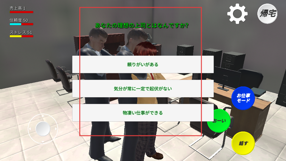 4、當(dāng)出現(xiàn)你的理想上司是什么樣的問題時(shí),從選項(xiàng)里挑選,表達(dá)對(duì)理想上司的看法,影響游戲進(jìn)程。