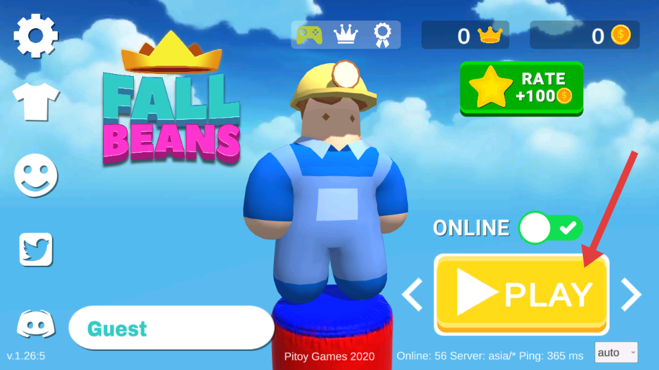 2、在主界面點擊PLAY按鈕即可進入游戲,確保ONLINE開關(guān)開啟可進行線上匹配,同時能通過給游戲評分獲得100初始金幣資金。