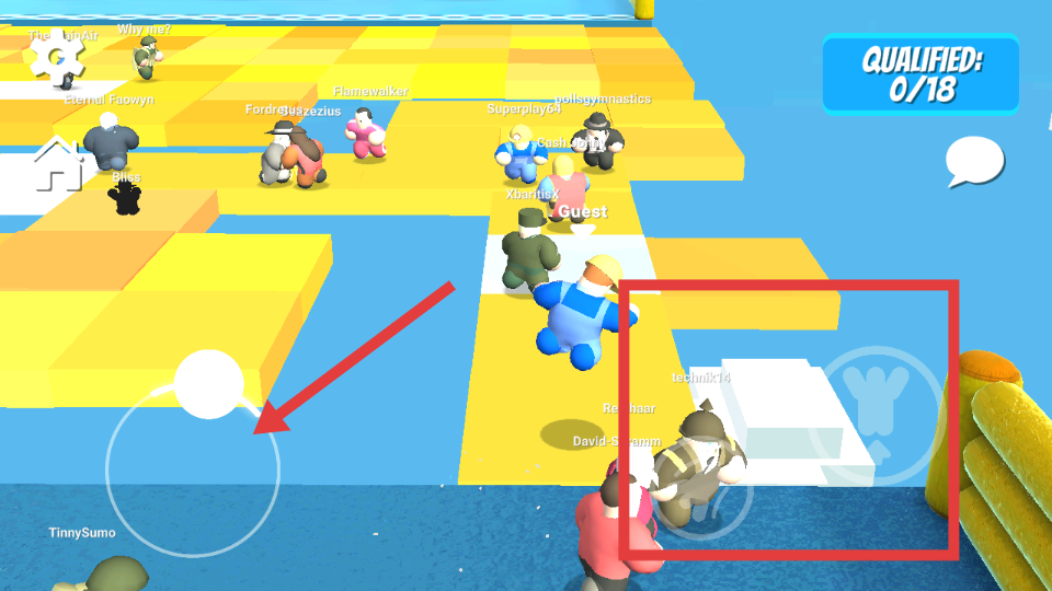 3、游戲中可通過屏幕左側(cè)虛擬搖桿控制角色移動,注意躲避其他玩家和障礙物,爭取進入右上角顯示的合格玩家名單,努力成為最終獲勝者。