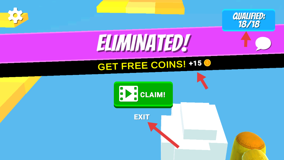 4、被淘汰后界面會顯示ELIMINATED,此時可點擊CLAIM看廣告領(lǐng)取15金幣,若不想繼續(xù)游戲點擊EXIT退出,右上角可查看合格玩家數(shù)量。