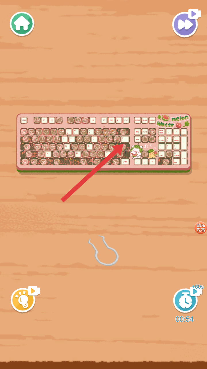 3、清理完表面后,下方會(huì)出現(xiàn)鑷子工具,用鑷子可以將鍵盤(pán)按鍵縫隙里殘留的臟東西夾出來(lái),進(jìn)一步清潔鍵盤(pán)。
