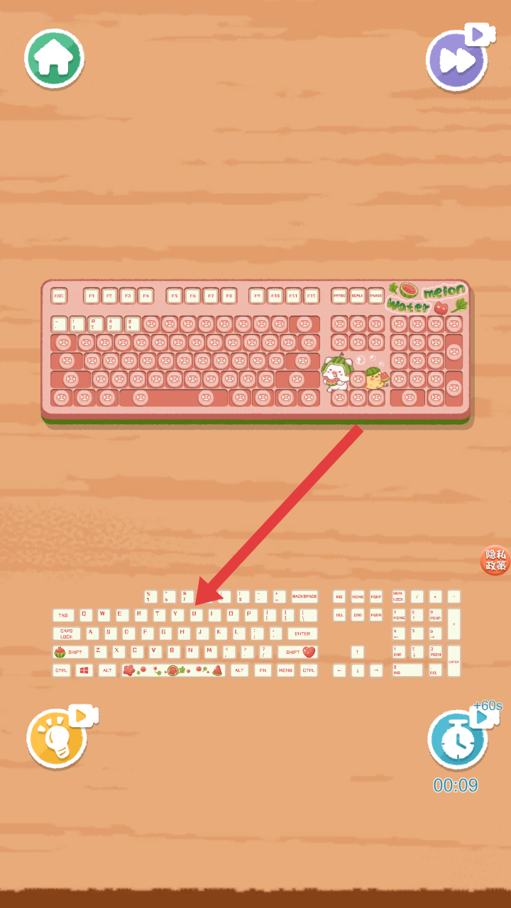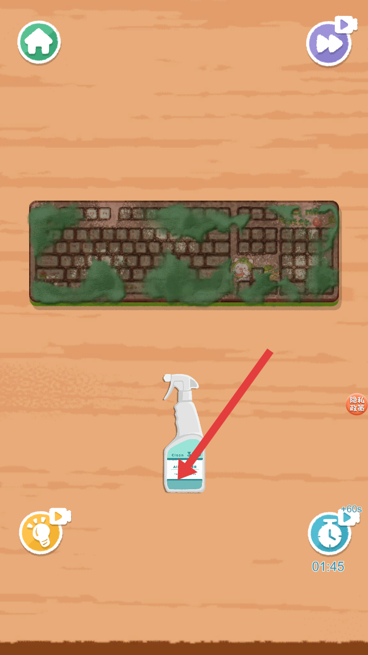 1、進(jìn)入游戲后,看到臟污的鍵盤(pán),下方有清潔劑噴霧瓶,點(diǎn)擊噴霧瓶,可將清潔劑噴灑到鍵盤(pán)上,為后續(xù)清潔做準(zhǔn)備。
