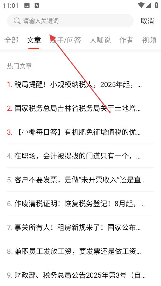 2、搜索結(jié)果頁(yè),切換文章分類(lèi),瀏覽熱門(mén)文章列表,點(diǎn)擊感興趣標(biāo)題,查看詳細(xì)內(nèi)容,學(xué)習(xí)財(cái)稅知識(shí)、行業(yè)動(dòng)態(tài),提升專(zhuān)業(yè)認(rèn)知。