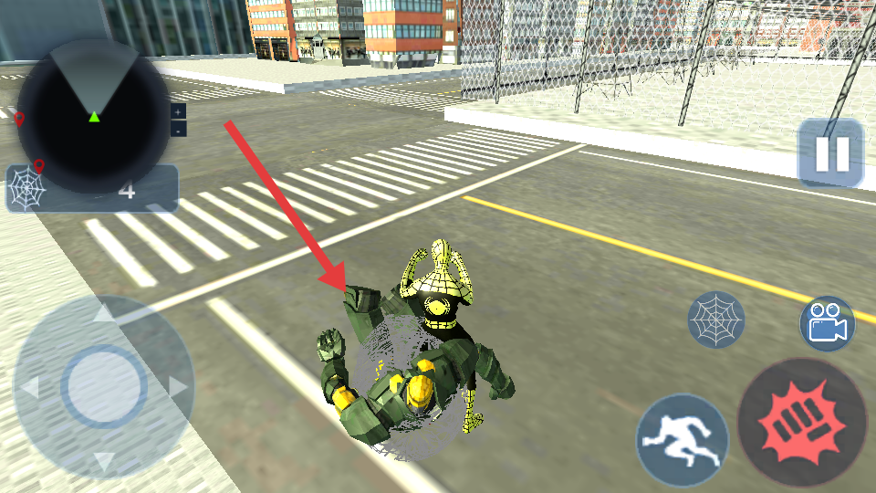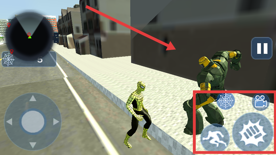 4、點(diǎn)擊屏幕右側(cè)的蜘蛛絲按鈕,角色可以發(fā)射蜘蛛絲,用于攀爬建筑物此外還能利用蜘蛛絲牽制或攻擊敵人。