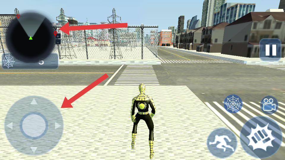 2、進(jìn)入游戲場(chǎng)景后通過(guò)屏幕左下角的虛擬搖桿控制角色移動(dòng)方向,在城市環(huán)境中自由探索,左上角的小地圖可以幫助了解敵人位置。