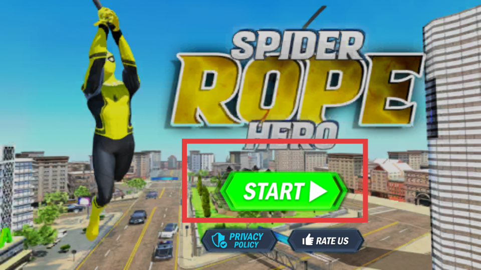 1、在游戲的初始界面,點(diǎn)擊綠色的START按鈕,進(jìn)入游戲的主場(chǎng)景,準(zhǔn)備操控忍者飛行蜘蛛繩英雄展開(kāi)冒險(xiǎn)。