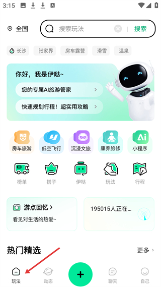 1、玩法板塊有搜索欄,設(shè)房車(chē)旅游、低空飛行等入口,推AI管家伊噠規(guī)劃行程,底部有玩法、動(dòng)態(tài)等功能欄。