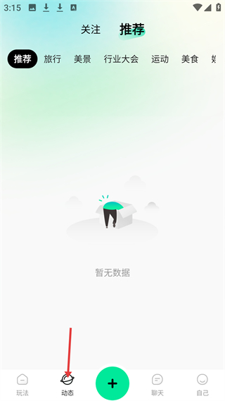 2、動(dòng)態(tài)板塊有關(guān)注、推薦分類,推薦欄下設(shè)旅行、美景等標(biāo)簽,當(dāng)前暫無(wú)數(shù)據(jù),底部有功能欄可切換頁(yè)面。