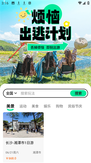 3、煩惱出逃計(jì)劃板塊推出游活動(dòng),有搜索欄和美景等分類,展示長(zhǎng)沙湘潭1日游產(chǎn)品,售價(jià)668元。