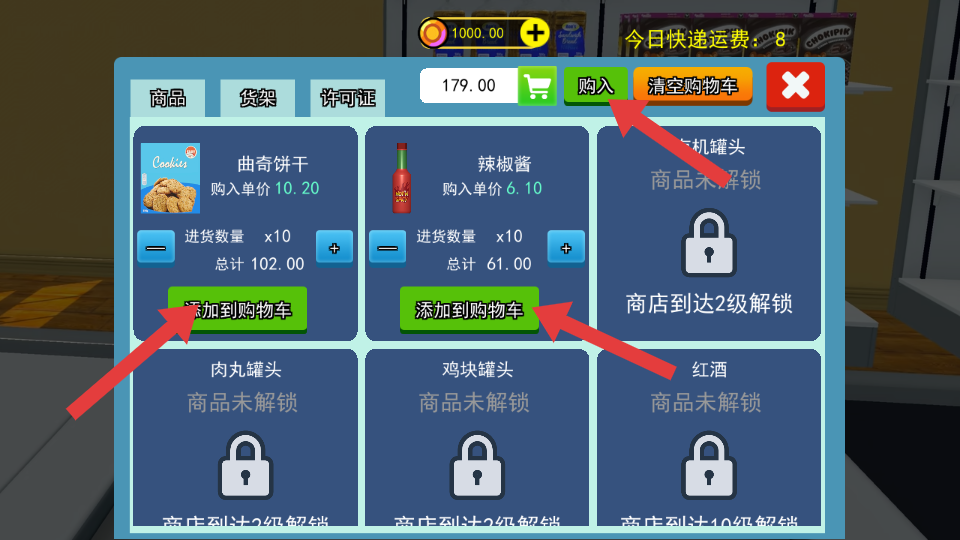 2、在商品采購界面,選好曲奇餅干、辣椒醬等商品,點擊添加到購物車,再點購入,就能完成進貨。