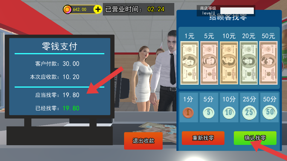 4、顧客付款后,根據(jù)屏幕顯示的應(yīng)當找零金額,在右側(cè)選擇對應(yīng)面值錢幣找零,最后點擊確認找零完成收銀。