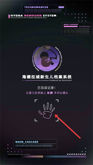 1、需完成新生兒檔案記錄,讓嬰兒在終端上長按手印確認,完成初始記錄流程。