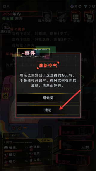 3、在事件里可選擇不同選項,如運動等,不同選擇會影響嬰兒的屬性發(fā)展,推進成長進程。