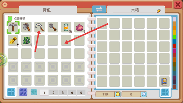 2、在背包和木箱界面,可移動物品,整理工具等道具,方便后續(xù)清理莊園等操作時快速取用。