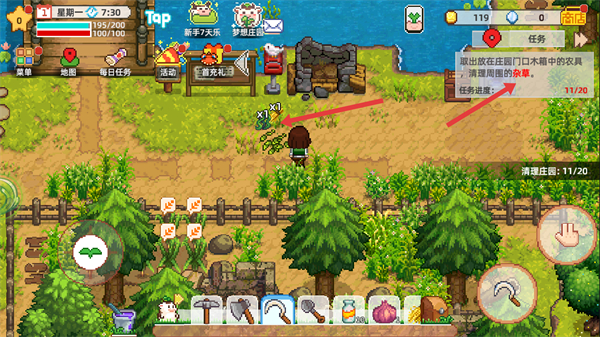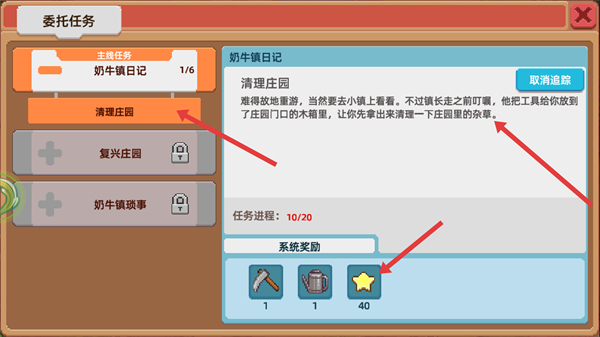 1、可接取清理莊園等委托任務(wù),按照任務(wù)提示,從莊園門口木箱拿工具,清理莊園雜草,完成任務(wù)獲取獎勵。