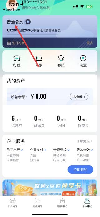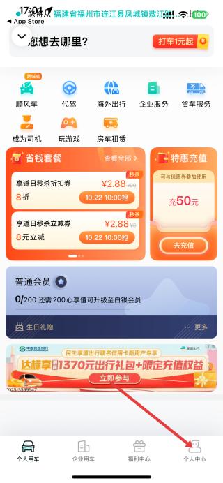3、進(jìn)入享道出行主界面,能看到順風(fēng)車(chē)、代駕等服務(wù)入口,還有省錢(qián)套餐、特惠充值等板塊,點(diǎn)擊個(gè)人中心。
