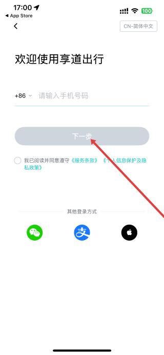 1、打開(kāi)享道出行,進(jìn)入登錄頁(yè)面,輸入手機(jī)號(hào)碼,勾選同意服務(wù)條款、信息保護(hù)及隱私政策后,點(diǎn)擊下一步。