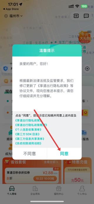 2、登錄后會(huì)彈出溫馨提示,提示修訂更新了享道出行隱私政策等協(xié)議文件,點(diǎn)擊同意,繼續(xù)使用。