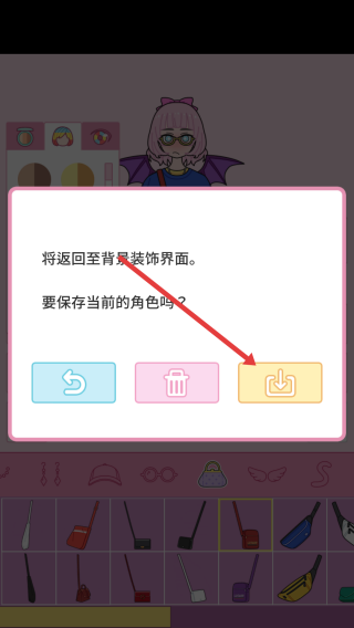 3、裝扮完成后,若要返回背景裝飾界面,會彈出是否保存當前角色的提示,點擊黃保存按鈕保存角色。
