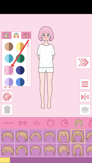 1、進入游戲,裝扮界面選擇自己喜歡的粉紅色等顏色,為角色搭配發(fā)色等基礎形象。