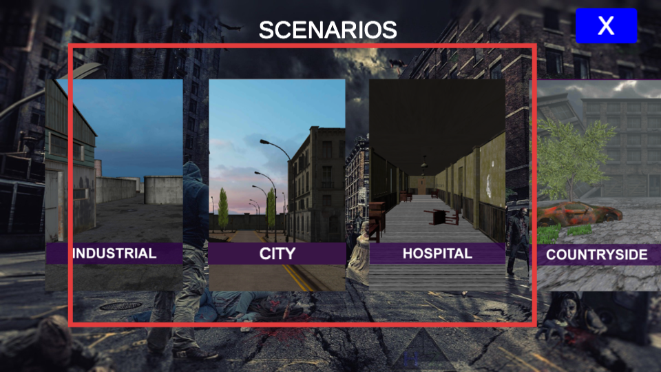 2、進(jìn)入場景選擇界面,有INDUSTRIAL、CITY、HOSPITAL等場景可選,根據(jù)喜好點(diǎn)擊對應(yīng)的場景,就能進(jìn)入該場景開始游戲。