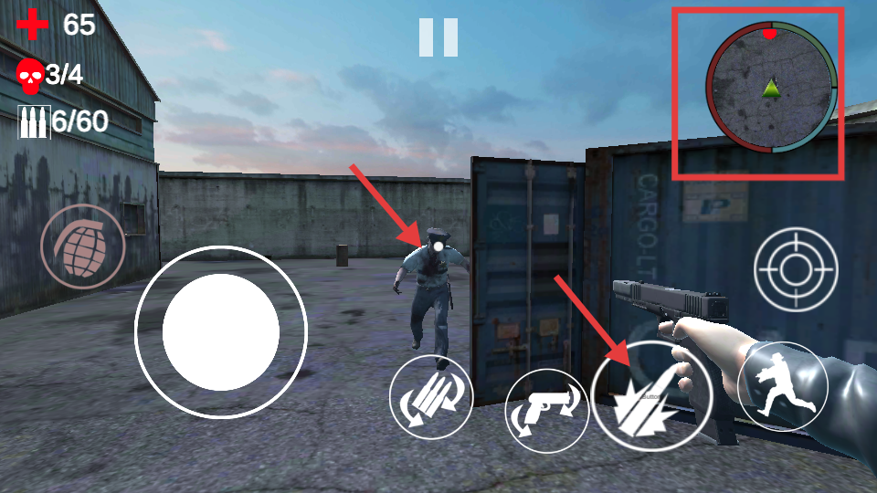 3、游戲中利用左側(cè)虛擬搖桿移動(dòng),借助右上角小地圖觀察僵尸位置,看到僵尸時(shí)可點(diǎn)擊攻擊按鈕對其發(fā)起攻擊消滅僵尸。
