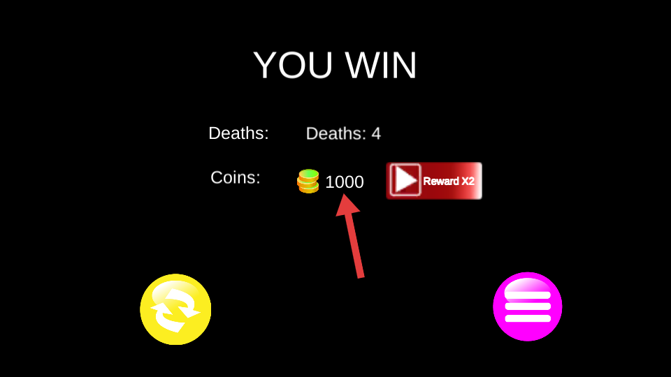 4、成功通關(guān)后屏幕會顯示YOU WIN,還能獲得1000金幣獎(jiǎng)勵(lì),可點(diǎn)擊RewardX2看廣告翻倍獎(jiǎng)勵(lì),也能選擇重新游戲或查看菜單。