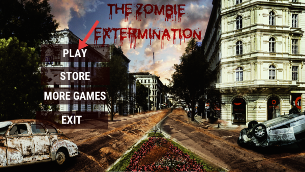 1、游戲主界面有PLAY、STORE、MORE GAMES、EXIT選項(xiàng),點(diǎn)擊PLAY即可進(jìn)入游戲,開啟僵尸滅絕的挑戰(zhàn)。