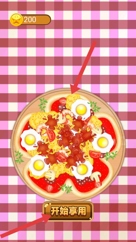 4、烤制完成后,披薩會呈現(xiàn)在餐布上,此時點擊開始享用按鈕,即可享受制作好的美味披薩。