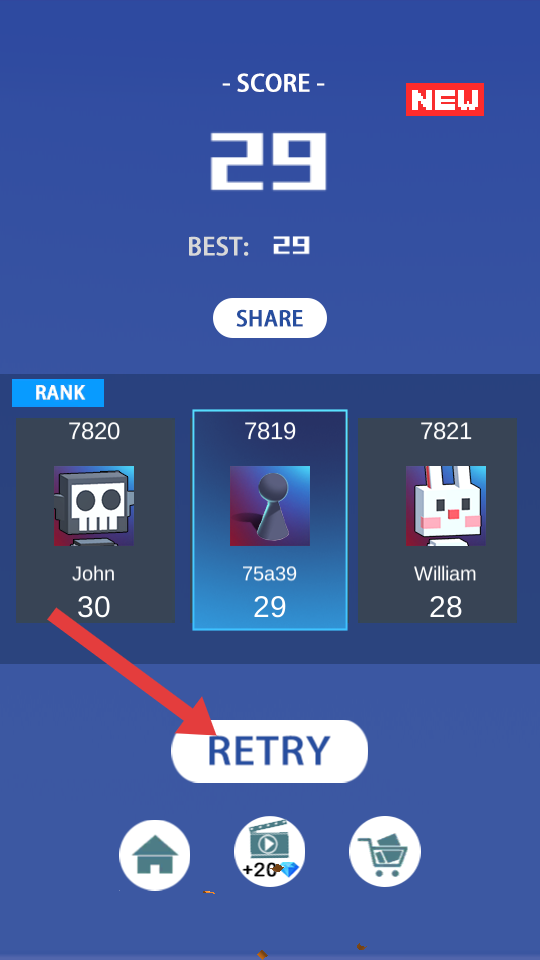 4、當(dāng)?shù)梅纸缑骘@示后,若想再次挑戰(zhàn),點(diǎn)擊重試按鈕,重新開始游戲,爭(zhēng)取獲得更高分?jǐn)?shù)。