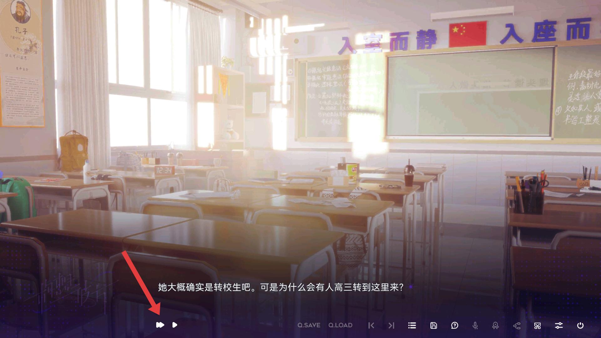 4、點(diǎn)擊界面下方的播放按鈕,推進(jìn)劇情,看著故事在教室等場(chǎng)景中繼續(xù),了解轉(zhuǎn)校生等情節(jié),感受故事的魅力與懸念。