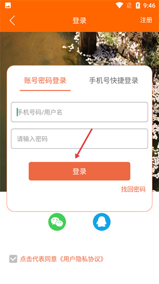 1、登錄界面有賬號(hào)密碼登錄和手機(jī)號(hào)快捷登錄兩種方式,可輸入賬號(hào)密碼登錄,也可通過微信、QQ登錄,且需同意用戶隱私協(xié)議。