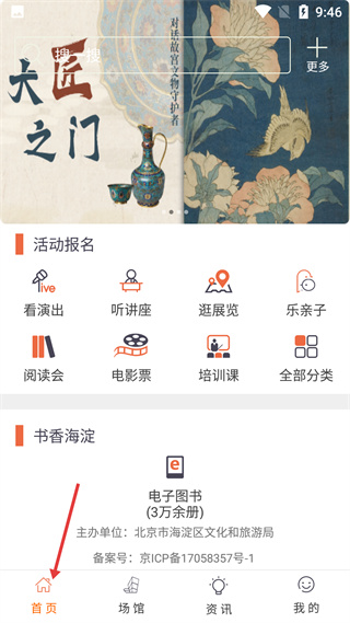 2、首頁有活動(dòng)報(bào)名板塊,可看演出、聽講座等,還有書香海淀板塊,提供3萬余冊(cè)電子圖書,主辦單位是海淀區(qū)文旅局。