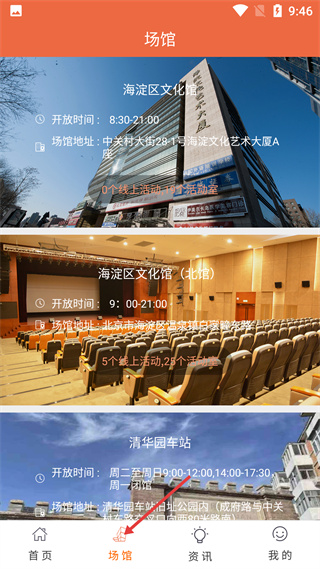 3、場(chǎng)館頁面展示了海淀區(qū)文化館、海淀區(qū)文化館北館、清華園車站三個(gè)場(chǎng)館,包含開放時(shí)間、地址及活動(dòng)和活動(dòng)室數(shù)量。