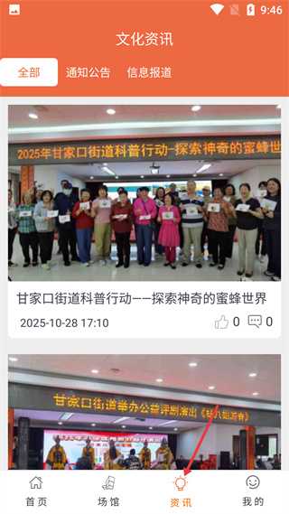4、文化資訊頁面有全部、通知公告、信息報(bào)道分類,展示了甘家口街道科普行動(dòng)和評(píng)劇演出的資訊。