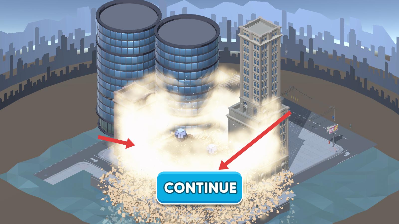 3、當建筑倒塌到一定階段,出現(xiàn)藍色CONTINUE按鈕時,點擊該按鈕,繼續(xù)后續(xù)的游戲步驟,讓建筑的變化進程得以延續(xù)。