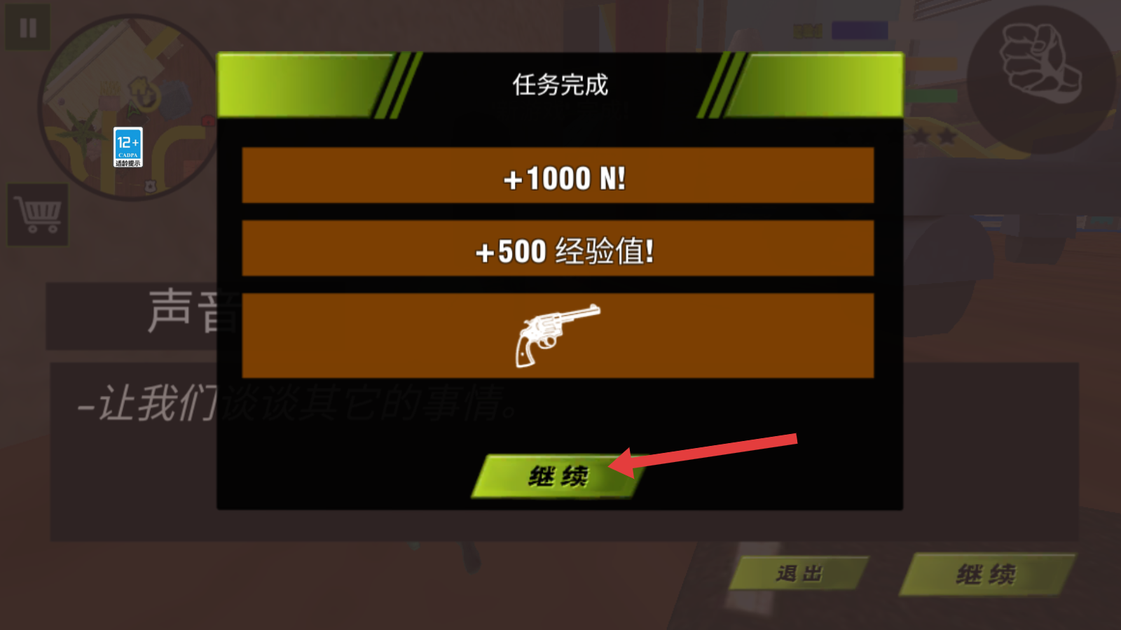 4、界面顯示任務(wù)完成后,可獲得經(jīng)驗值等獎勵,點擊繼續(xù)按鈕,進入下一個環(huán)節(jié)。