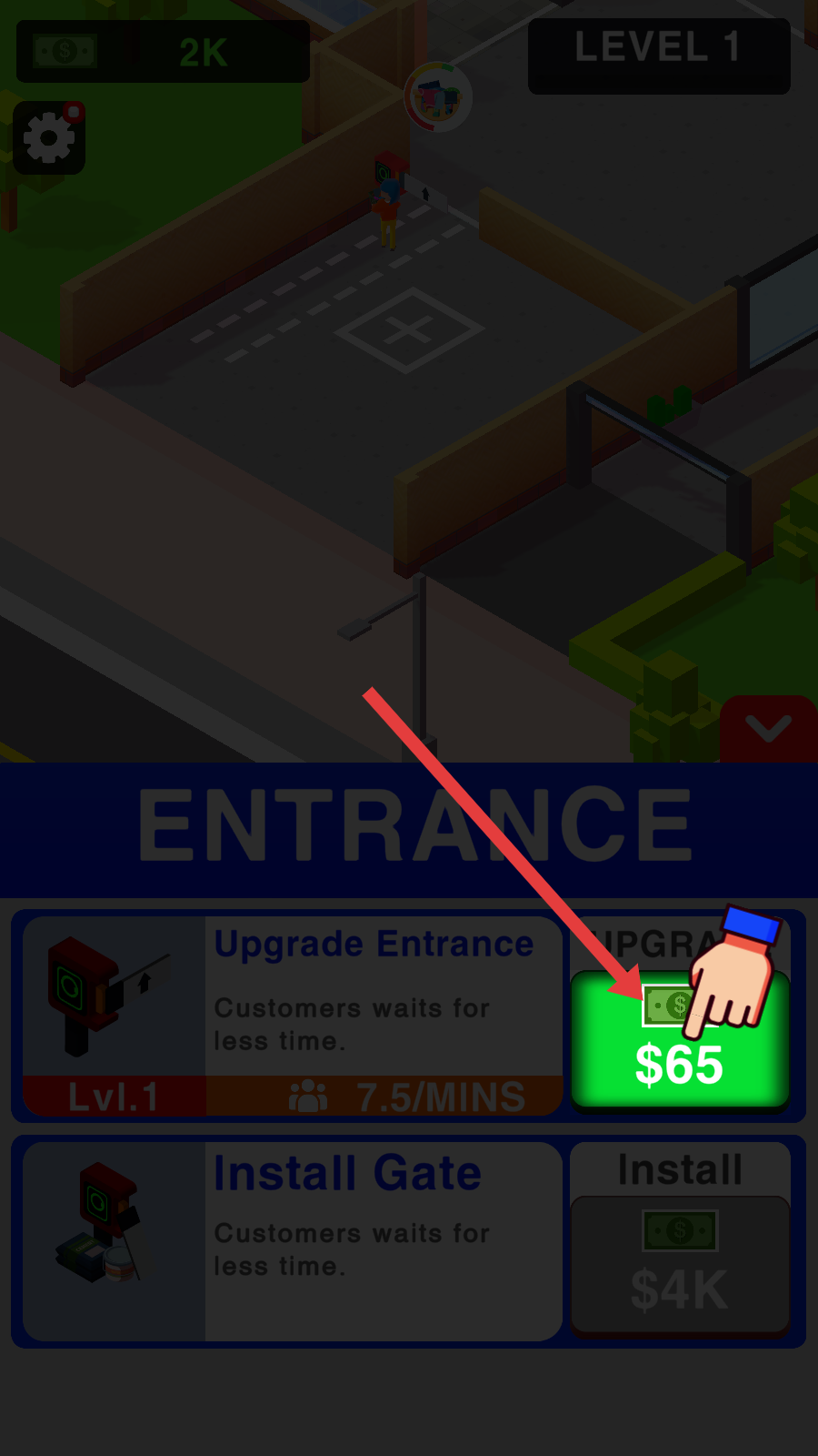 1、進入游戲先升級超市入口,花費65美元,這樣能減少顧客等待時間,提升顧客體驗,為超市運營打好基礎(chǔ)。