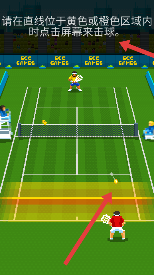 3、比賽時(shí)留意屏幕提示,當(dāng)直線處于黃線內(nèi)或橙色區(qū)域內(nèi)時(shí)點(diǎn)擊屏幕擊球,以此來和對(duì)手展開網(wǎng)球較量。