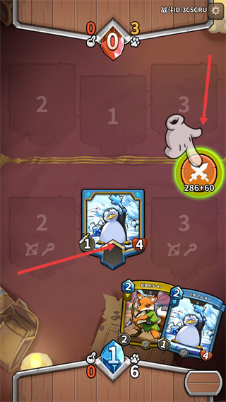 2、放置卡牌后,可點擊攻擊按鈕發(fā)動攻擊,卡牌有攻擊、防御等屬性,通過攻擊消耗對方血量。