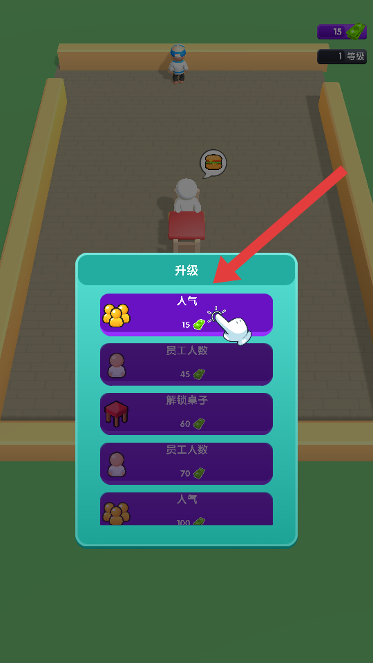4、完成服務(wù)流程后,出現(xiàn)升級(jí)界面,可消耗對(duì)應(yīng)的綠色寶石,選擇升級(jí)人氣等選項(xiàng),提升餐廳相關(guān)能力。