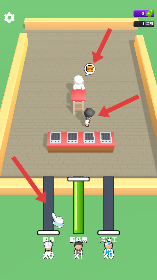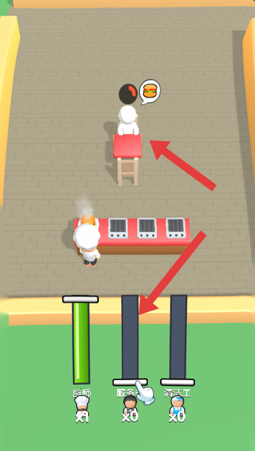 1、顧客有漢堡需求時(shí),點(diǎn)擊下方廚師欄,派遣廚師到烹飪區(qū)制作漢堡,為后續(xù)服務(wù)顧客做準(zhǔn)備。