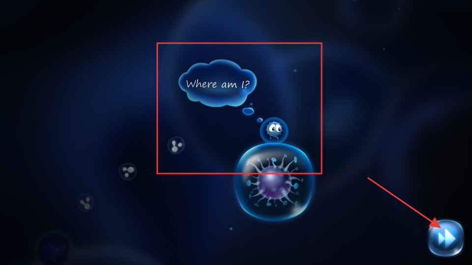 1、點擊箭頭按鈕,進(jìn)入游戲,操控細(xì)胞,根據(jù)提示引導(dǎo)細(xì)胞移動,開始探索場景,尋找目標(biāo)。