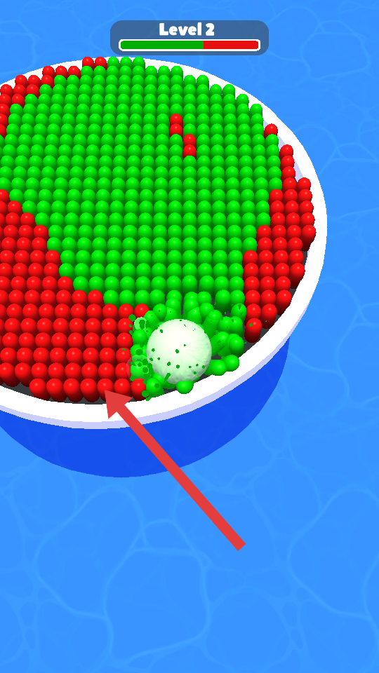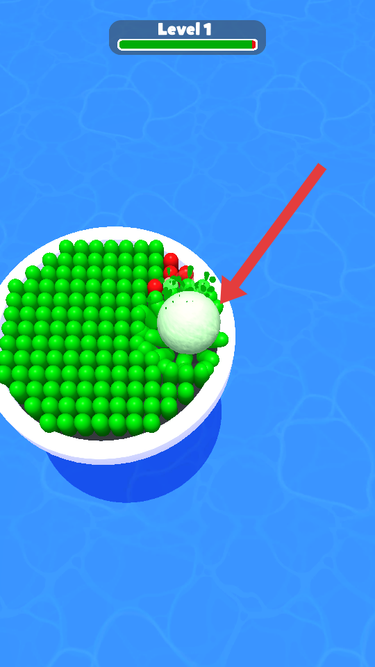 2、滑動(dòng)面板使白球滾動(dòng),撞擊紅色小球使其消除,同時(shí)白球會(huì)沾染綠色,繼續(xù)滾動(dòng)可消除更多同色小球,推進(jìn)關(guān)卡進(jìn)度。