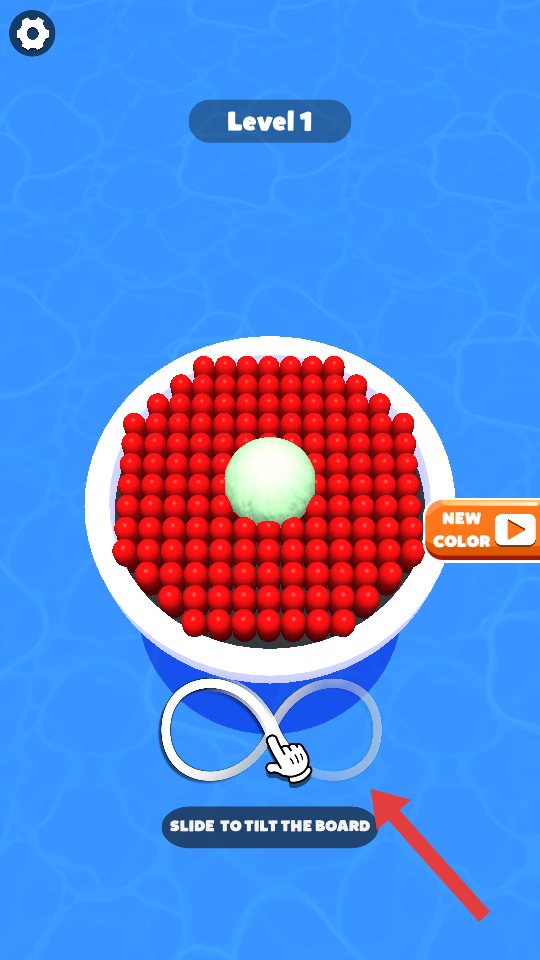 1、在關(guān)卡1初始界面,根據(jù)提示滑動(dòng)屏幕傾斜面板,讓中間的白球滾動(dòng),開始消除紅色小球。