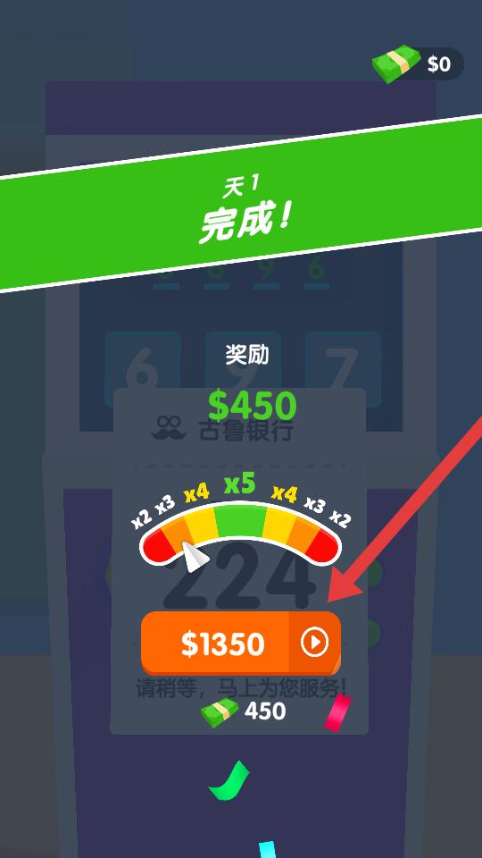 4、完成當(dāng)天服務(wù)后,界面顯示1天完成,可獲得450資金獎(jiǎng)勵(lì),點(diǎn)擊1350對(duì)應(yīng)的按鈕,可嘗試獲取更多獎(jiǎng)勵(lì),繼續(xù)后續(xù)游戲。