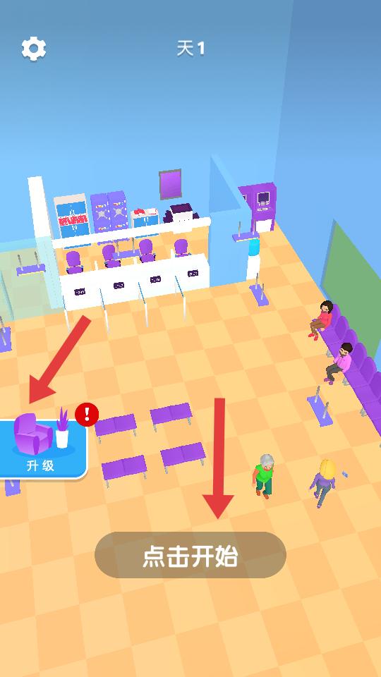 1、在游戲初始界面,可先關(guān)注升級(jí)提示區(qū)域,查看可升級(jí)的設(shè)施,之后點(diǎn)擊開(kāi)始,進(jìn)入當(dāng)天的銀行服務(wù)流程。