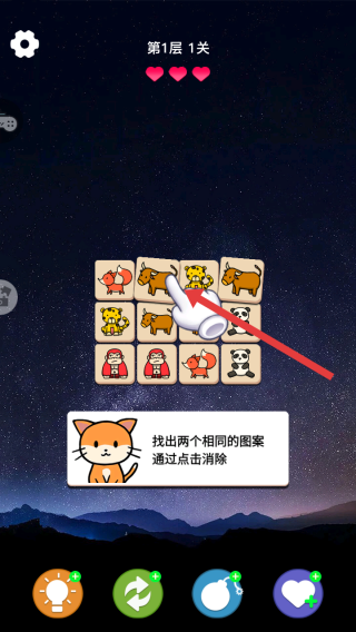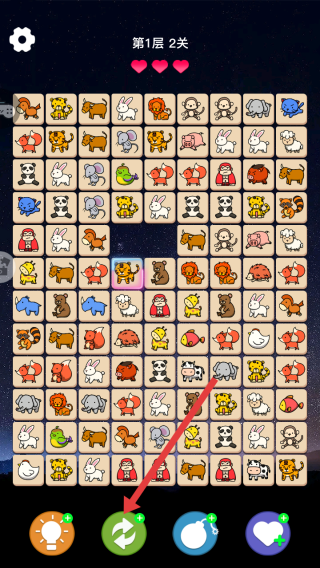 4、第1層2關(guān),方塊數(shù)量大幅增加,動(dòng)物圖案更多,若難以找到相同圖案,可點(diǎn)擊下方綠色箭頭按鈕,刷新方塊布局。