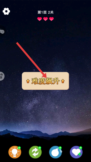3、從第1層1關(guān)進(jìn)入第1層2關(guān)時(shí),會(huì)出現(xiàn)難度飆升提示,意味著后續(xù)關(guān)卡難度加大,要更仔細(xì)找相同圖案。