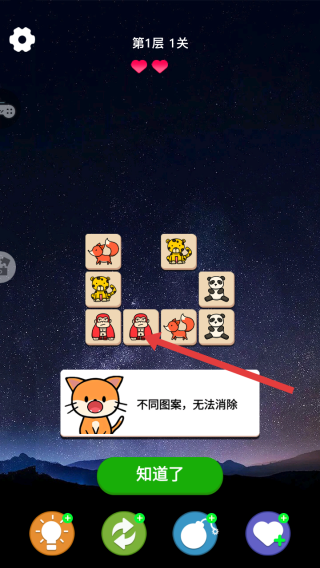 2、若點(diǎn)擊的是不同圖案,會(huì)提示不同圖案,無法消除,此時(shí)點(diǎn)擊知道了,重新尋找相同圖案進(jìn)行消除。